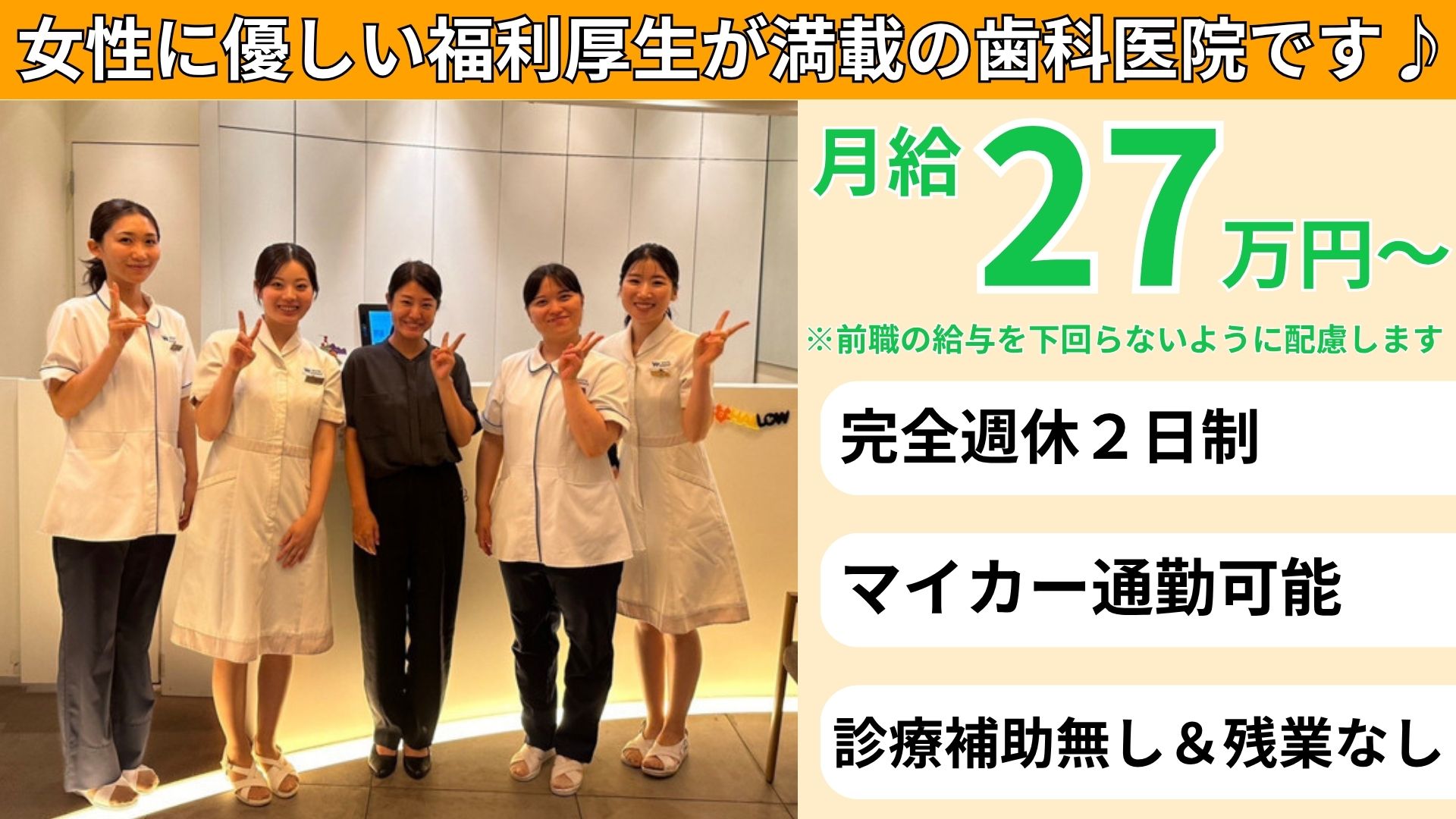 【月給27万~】残業ゼロ×診療補助なし×車通勤可能!女性に優しい福利厚生が満載の歯科医院です♪